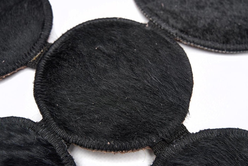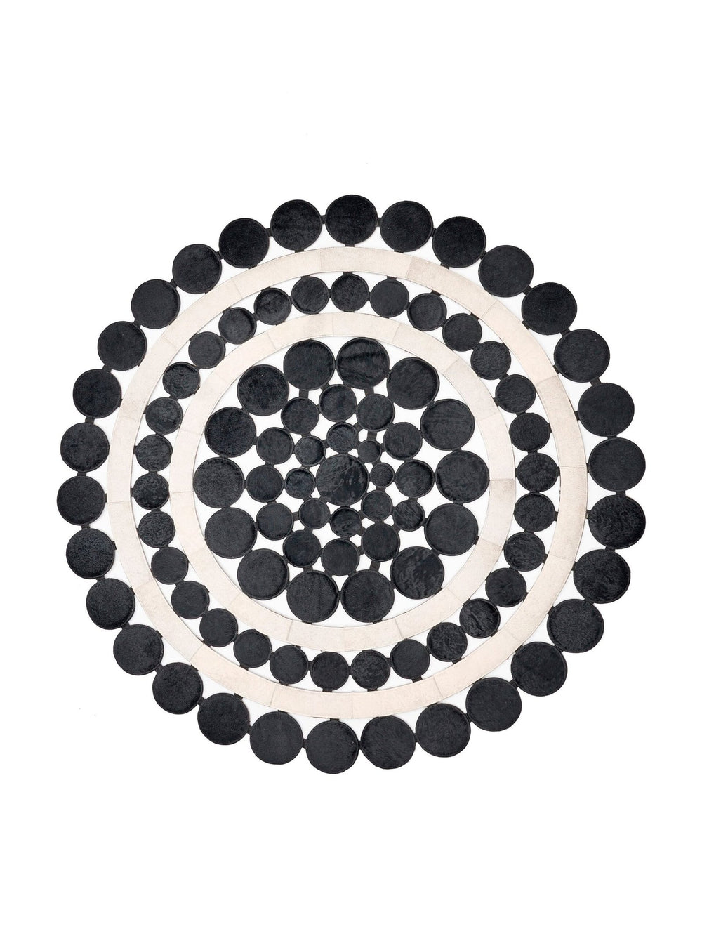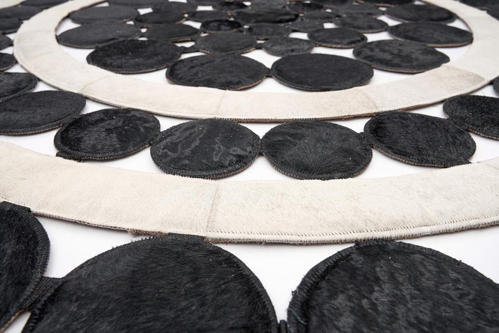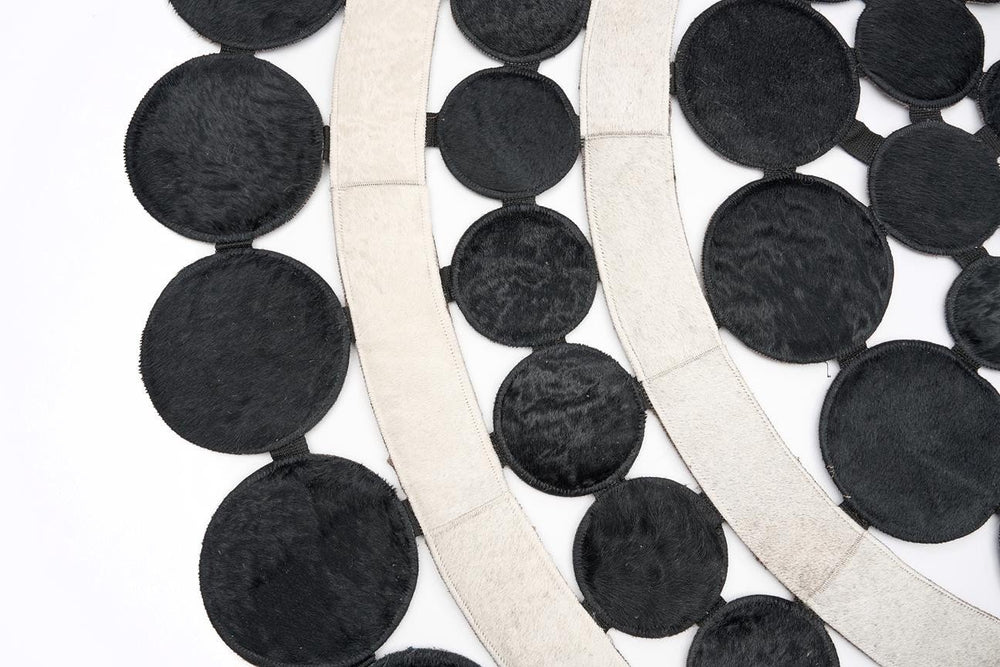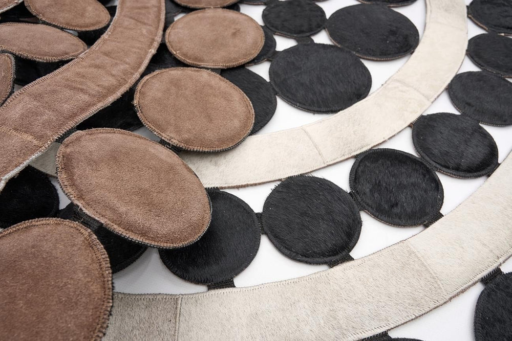 Halının yuvarlak şekli, mekanlarda dengeli ve hoş bir görünüm oluşturur. Deri malzeme, geleneksel halı dokuma tekniklerinden farklı olarak sağlamlık ve estetik sunar. Bu halı, estetik ve fonksiyonellik açısından birçok avantaj sunar. El dokuma halı tekniği ile üretilmiş olması, her detayının özenle işlendiğini gösterir.