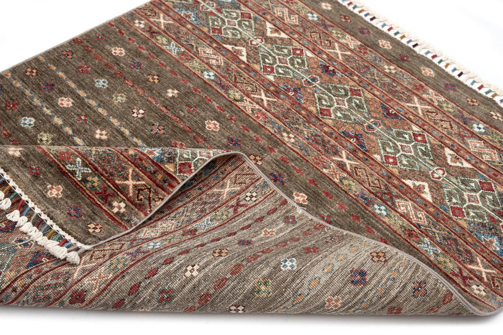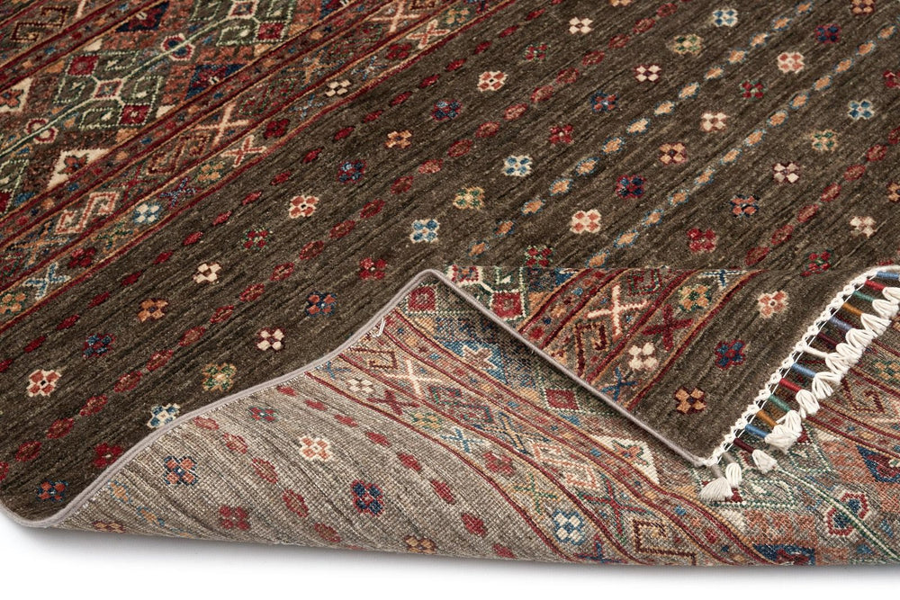 Halı, düğüm saçaklarıyla zarif bir görünüm kazanır. El dokuma yöntemiyle üretilmiş olması, her bir halının benzersiz olmasını sağlar. Modern yaşam alanlarına kolayca uyum sağlar ve dekorasyona farklı bir boyut katar.