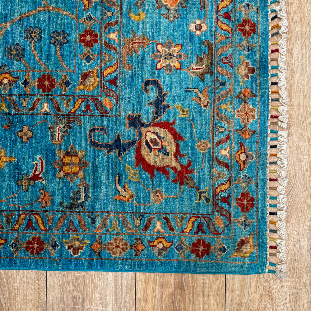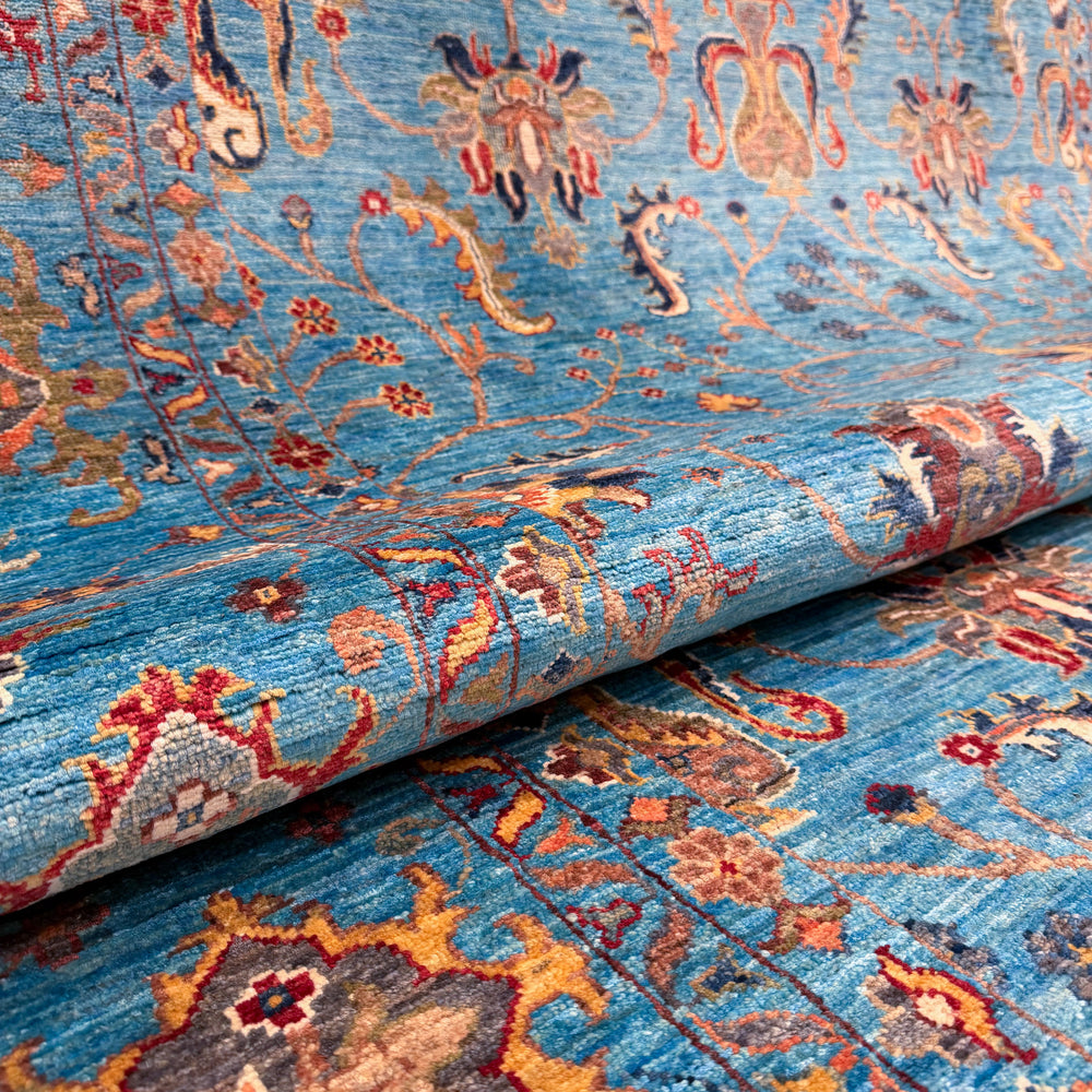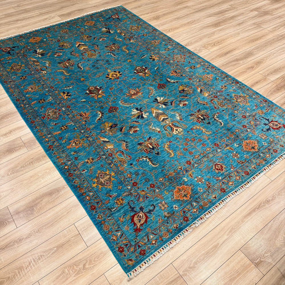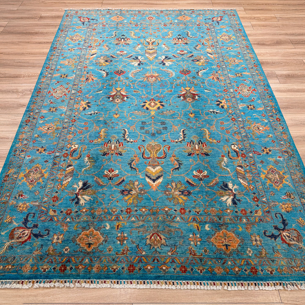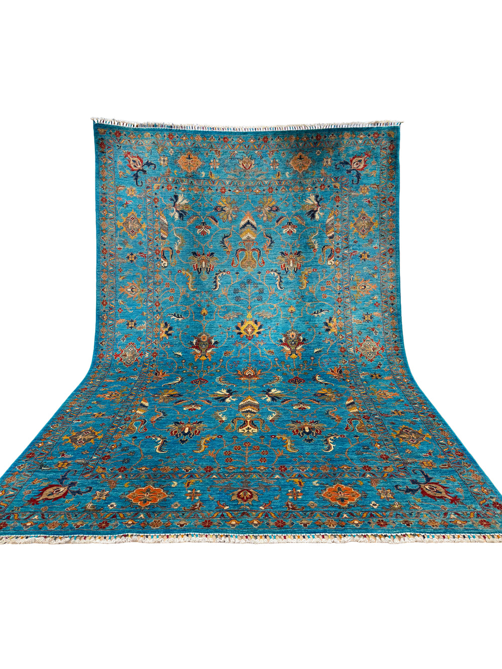 Öğretmenler Halı El Dokuma Sultani Halı, evinize veya ofisinize zarafet katacak bir parça. Bu halı, mavi rengin canlı tonlarıyla doludur. Renk, mekânınıza ferahlık ve şıklık katar. Dikdörtgen formu sayesinde, her türlü alanı mükemmel bir şekilde tamamlar. Bu tasarım, hem klasik hem de modern dekorasyon tarzlarıyla uyum sağlar.