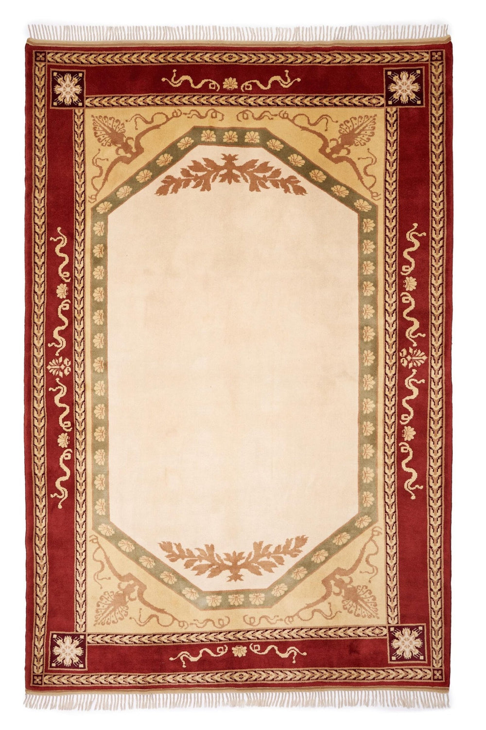 Düz saçaklarla tamamlanan tasarımı, bu halıya modern bir zarafet katar. Saçakların sade görünümü, halının renkleri ve desenleri ile kusursuz bir uyum içindedir. Saçaklar, halının geleneksel havasını korurken aynı zamanda minimalist bir şıklık da sunar. Bu özel detay, halıya özgün bir kimlik kazandırır ve bulunduğu mekâna sıcaklık katar.
