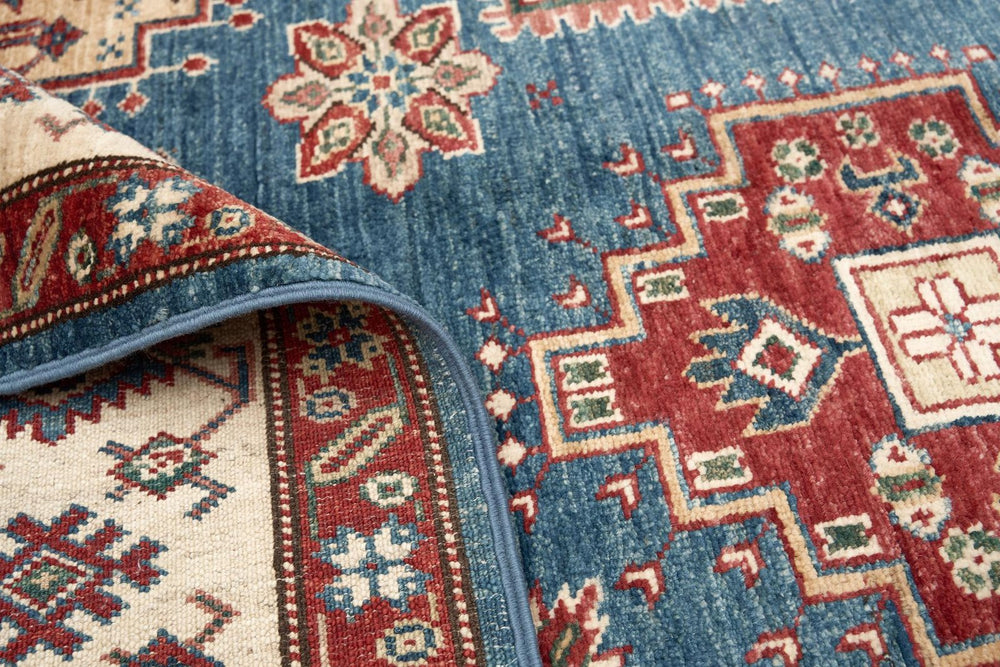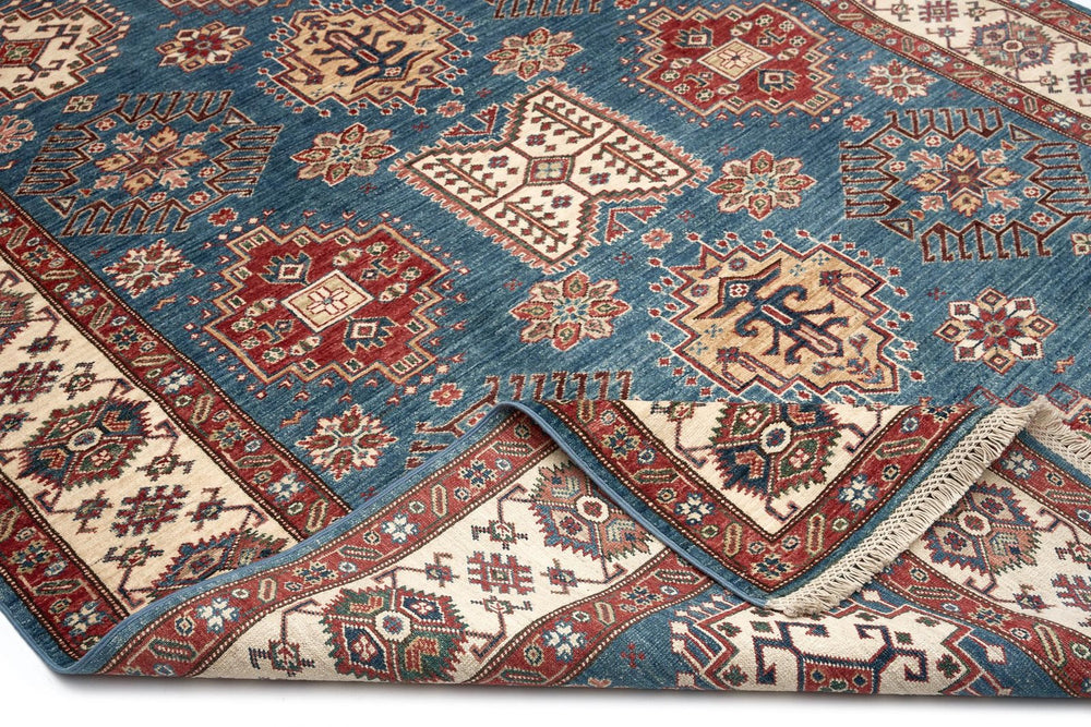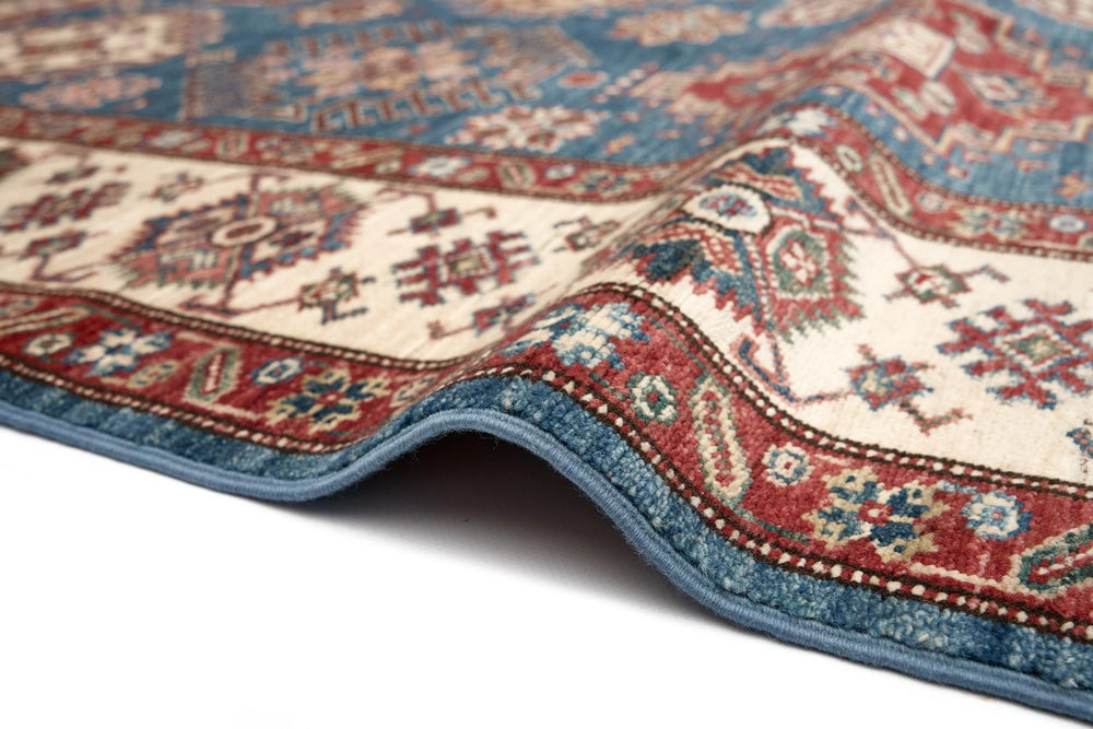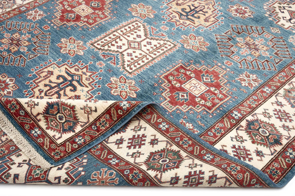 Bu el dokuma halı, her bir ilmik özenle işlenerek elde edilmiştir. Yüksek dokuma sıklığı sayesinde uzun süreli kullanımlar için uygundur. Halının düz saçak tipi, sade bir estetik sunar. Mavi rengi ise hem sıcak hem de serin tonlarla kolayca uyum sağlar.