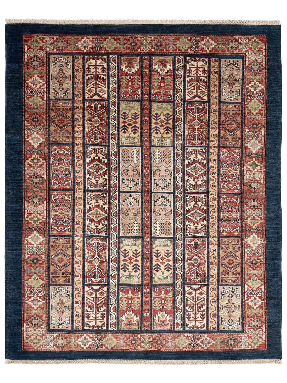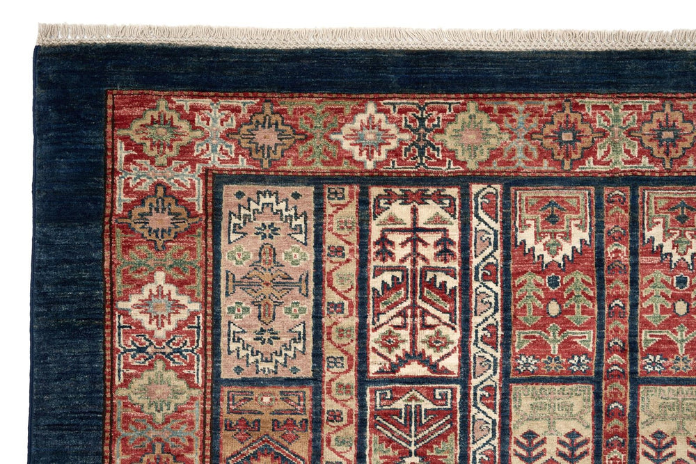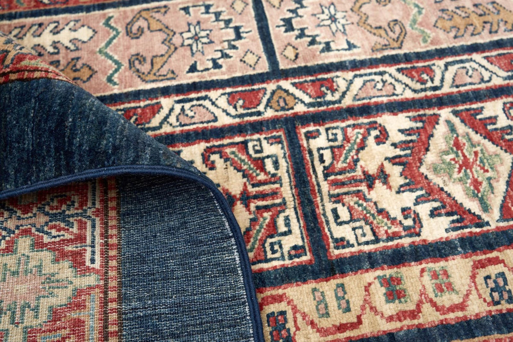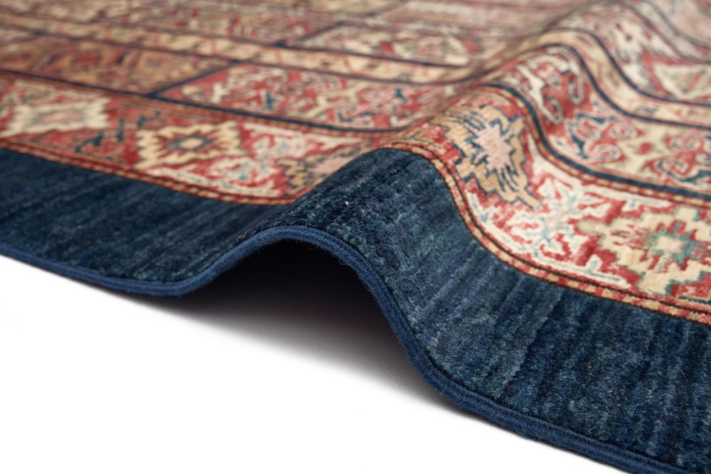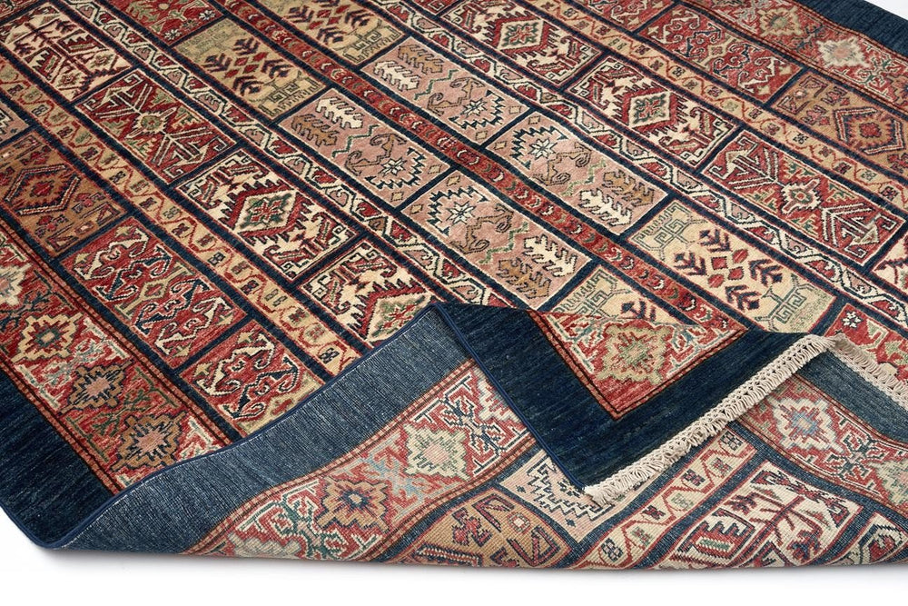 Halının lacivert tonları, mekânınıza modern ve zarif bir hava katarken, yün ve pamuk karışımının sağladığı dayanıklılık uzun süreli kullanım sağlar. Doğal boyama teknikleri sayesinde renkler uzun yıllar canlı kalır. Bu halı, sadece görsel değil, fonksiyonel açıdan da yaşam alanınıza değer katar.